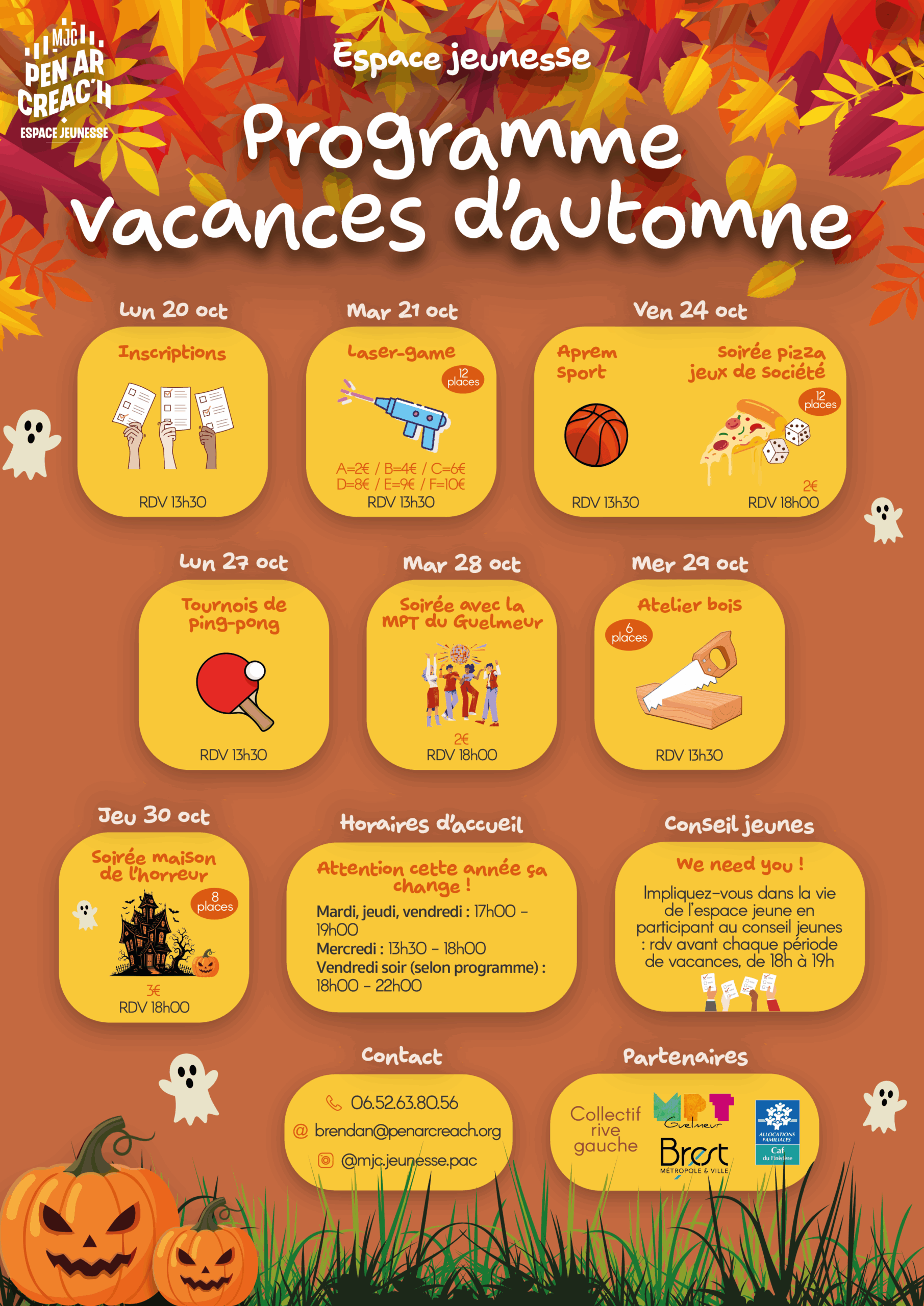 13 Oct Ado / Info Programme espace jeunesse – c’est les vacances d’automne ! đ by Laurence Mercier DĂ©couvre vite notre programme d’activitĂ©s pour les vacances d’automne Ă la Maison Pour Tous de Pen Ar CrĂ©ac’h ! Pour toute inscription ou pour plus de renseignements, envoyez-nous un message sur les rĂ©seaux sociaux ou contactez-nous au 06.52.63.80.56 ! DĂ©couvre le programme !
